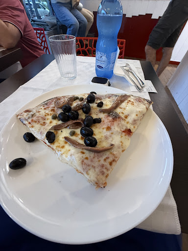 Ho ordinato un trancio abbondante di pizza margherita con olive, capperi e acciughe. • L’impasto, nella parte centrale, era accettabile/discreto. • Tuttavia, verso i bordi (quelli a contatto con la teglia), la consistenza diventava troppo dura e difficile da masticare, quasi come del pane vicino alla crosta. • Il pomodoro e la mozzarella erano visivamente nella norma, ma mangiandola sembrava mancasse un po’ di sapore, probabilmente per una quantità troppo scarsa di entrambi. • Gli ingredienti aggiunti (acciughe, olive, capperi) non mi hanno convinto: la qualità va migliorata per farli rendere al meglio nella combinazione.