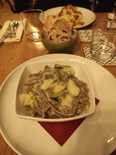 Read moreCi sono stata settimana scorsa a cena con un'amica. Siamo arrivate alle 18:50 che ancora la cucina non era aperta ma ci hanno fatte comunque accomodare dicendoci che avremmo dovuto attendere una decina di minuti. Nel frattempo ci siamo lette il menù quindi nessun problema! Io ho ordinato i pizzoccheri e la cheesecake ed erano entrambi buonissimi! I pizzoccheri abbondanti, morbidi, per niente asciutti (quindi scivolavano bene in bocca), formaggiosi, con giusta quantità di verdure, consistenza come piace a me (formaggio fuso ma non liquido) e sapore top. Si giocano con un altro locale il primo posto dei migliori mai mangiati (e ne ho mangiati parecchi). Prezzo 12€ se non erro, quindi assolutamente corretto. La cheesecake mi ha sorpreso molto, viene servita una bella fettona con a scelta sopra una salsa al cioccolato o ai frutti di bosco. La porzione è decisamente generosa e la qualità elevata. Devo dire che è la cheesecake migliore per consistenza e sapore che io abbia mai mangiato. Non è pesante o gnucca ma ariosa e morbida, si scioglie in bocca. La salsa di cioccolato (sul menù c'è scritto ganache a dire il vero, ma è molto liquida, sembra di quelle che si comprano nel tubetto) non mi ha fatto impazzire, ma non ha comunque rovinato il dolce. Il prezzo dei dolci è altino (6€) ma accettabile considerando porzione e bontà. Riprenderei tutto e proverei volentieri i taglieri che mi ispirano molto ma anche il risotto con l'ossobuco (anche se i secondi salgono parecchio di prezzo, siamo sui 24€). Ci sono diverse opzioni vegetariane e vegane per ogni parte del menù. Una notina negativa la devo dare alla location dove abbiamo mangiato, un dehor esterno chiuso con dei teli di plastica credo, che in questa stagione risulta comunque un po' freddino. In ogni caso non vedo già l'ora di tornarci per la bontà dei...