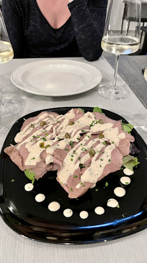 Read moreIch bin fasziniert über die positiven Bewertungen, welche auch ausschlaggebend für unseren Besuch waren. Meinen Gaumen sprechen die Gerichte für das Preis/Leistungsverhältnis definitiv nicht an. Mir kommt es fast so vor, als wäre das Restaurant für deutsche Touristen ausgelegt. In Italien ist es üblich mehrere Gänge zu bestellen, doch für mein Gusto waren die Portionsgrößen für Antipasti und Primo Piatto viel zu groß. Jede auf den Bildern zu sehende Portion habe ich alleine gegessen. Nun zu den Gerichten selbst: Das Kalbsfleisch beim Vitello tonnato war viel zu dick geschnitten. Die Thunfischsoße in Kombination mit Kapern waren in Ordnung. Die Linguine an schwarzer Trüffelsoße mit Pecorino waren das Highlight des Abends. Wenn ich davon nur einen Teller essen müsste, wäre der Gang perfekt gewesen. Der Oktopus war 2x gebraten und gab es mit einer Art Kartoffelsuppe. Beides war geschmacklich nicht gut abgestimmt. Der Oktopus war in der Konsistenz in Ordnung, jedoch zu fad im Geschmack. Die Kombination mit der Kartoffelsuppe kann ich nicht ganz nachvollziehen, zumal diese geschmeckt hat wie aus einem Thermomix zubereitet. Insgesamt mit einem stillen Wasser, einem Prosecco als Aperetif und einem roten Hauswein kam ich auf 77 €. Den Pistazien-Likör gab es immerhin aufs Haus! Das Ambiente ist in Ordnung. Hier werden wir nicht nochmal essen....