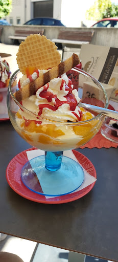 Due coppe gelato vaniglia e lamponi caldi, una fetta di torta allo yogurt con frutta ed un cuore di castagna. Tutto molto molto buono! I lamponi serviti a parte, così che il cliente li possa versare al momento sul gelato, senza presentarlo già sciolto: ottima idea. Personalmente il cuore di castagna non mi piace, ma la persona che l'ha mangiato l'ha trovato molto gradevole. Molto leggera e gustosa la fetta di torta. Prezzi onesti. Locale ben pulito, con tanto di un piccolo spazio bimbi all'ingresso e un piccolo acquario. Peccato solo che i camerieri non siano molto socievoli o attenti a chi arriva: siamo entrati ed andati via, senza ricevere nessun saluto. L'unico che ci ha salutati, ovviamente, era il cameriere da cui abbiamo ordinato e che ci ha preparato il conto, un ragazzo simpatico e gentile. Ci tornerei? Certo che si. Piaciuta molto anche la...