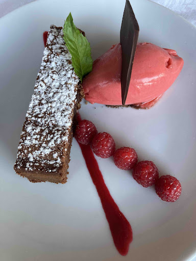 Per concludere, abbiamo preso due dolci. Il primo era un dessert alla nocciola con caffè, panna e liquore nocino: il sapore del nocino era piuttosto forte e in parte copriva il gusto del gelato e della panna. Comunque ben fatto, ma leggermente sbilanciato. Il secondo dolce era un krapfen ai semi di papavero, molto leggero e per niente pesante, davvero delizioso.