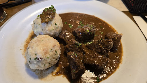 Mir persönlich war der Kaiserschmarrn zu fettig und erinnerte eher an Eierpfannekuchen... aber die Kids hatten es für sich als Hauptspeise bestellt und fanden es lecker. Meine Portion Gulasch sah etwas übersichtlich aus, reichte aber natürlich dennoch, um gut satt zu werden - geschmeckt hat es auch 🙂. Der Salat war ok. Der Service war nett und die Zwischengespräche zu anderen Tischen und deren Gästen spiegelte das herzliche, unkomplizierte Miteinander mit den (Stamm-) Gästen wieder. Schade ist, dass die Gastwirtschaft etwas in die Jahre gekommen aussieht. Ich vermute "Betriebsblindheit"... es gibt durchaus einiges, was man verbessern / putzen könnte... Die Polsterung der Bänke ist ein...