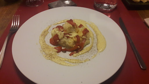 Più che un'osteria, piuttosto un ristorante gastronomico e di quelli buoni! Il sistema può piacere o no virgola farà comunque impazzire chi come me è pronto ad assaggiare tutto: la carta praticamente non esiste, ci sono solo delle combinazioni di piatti a differenti prezzi, il menù più caro si compone di due antipasti, un primo, un secondo e il dessert. La cosa che mi ha colpito è che al nostro tavolo, di 6 persone venivano portati tre differenti piatti a portata, due per tipo. Quindi in pratica una coppia aveva lo stesso piatto e noi abbiamo anche deciso di farli girare così da assaggiare un po' tutto (alla faccia del covid!) Il livello di alcuni piatti era veramente alto, con abbinamenti azzardati ma gestiti con Manu attenta e quindi piatti sempre equilibrati. Forse le portate su cui mi sarei aspettato di più erano proprio i piatti semplici da osteria, ad esempio una trippa in antipasto che secondo me era il meno riuscito di tutti. L'offerta dei vini segue quella dei cibi: nessuna carta e tante sorprese! Noi abbiamo scelto per conto nostro, guardando le varie bottiglie, tutte etichette ricercate e non banali, insomma non la cantina fotocopia dei vari locali in cui al momento imperano quel paio di distributori di moda. Bottiglie soprattutto francesi; Ho fatto due scoperte veramente interessanti, da ricomprare. Altro lato positivo e gestori del locale, due fratelli animati da sincera e pura passione gastronomica. Il conto non è regalato, noi abbiamo speso €80 a testa ma non facendoci mancare sicuramente vino a tavola... Facendo un bilancio tra tutto, quindi originalità, bontà, prezzo e posizione (Busca non è il luogo più facile da raggiungere, specie se come me si parte da Torino), vincono comunque i lati positivi, certo ahimè non il ristorante per ogni settimana ma quello da visitare periodicamente per capire come sta evolvendo la cucina, sono certo che si assaggeranno sempre...