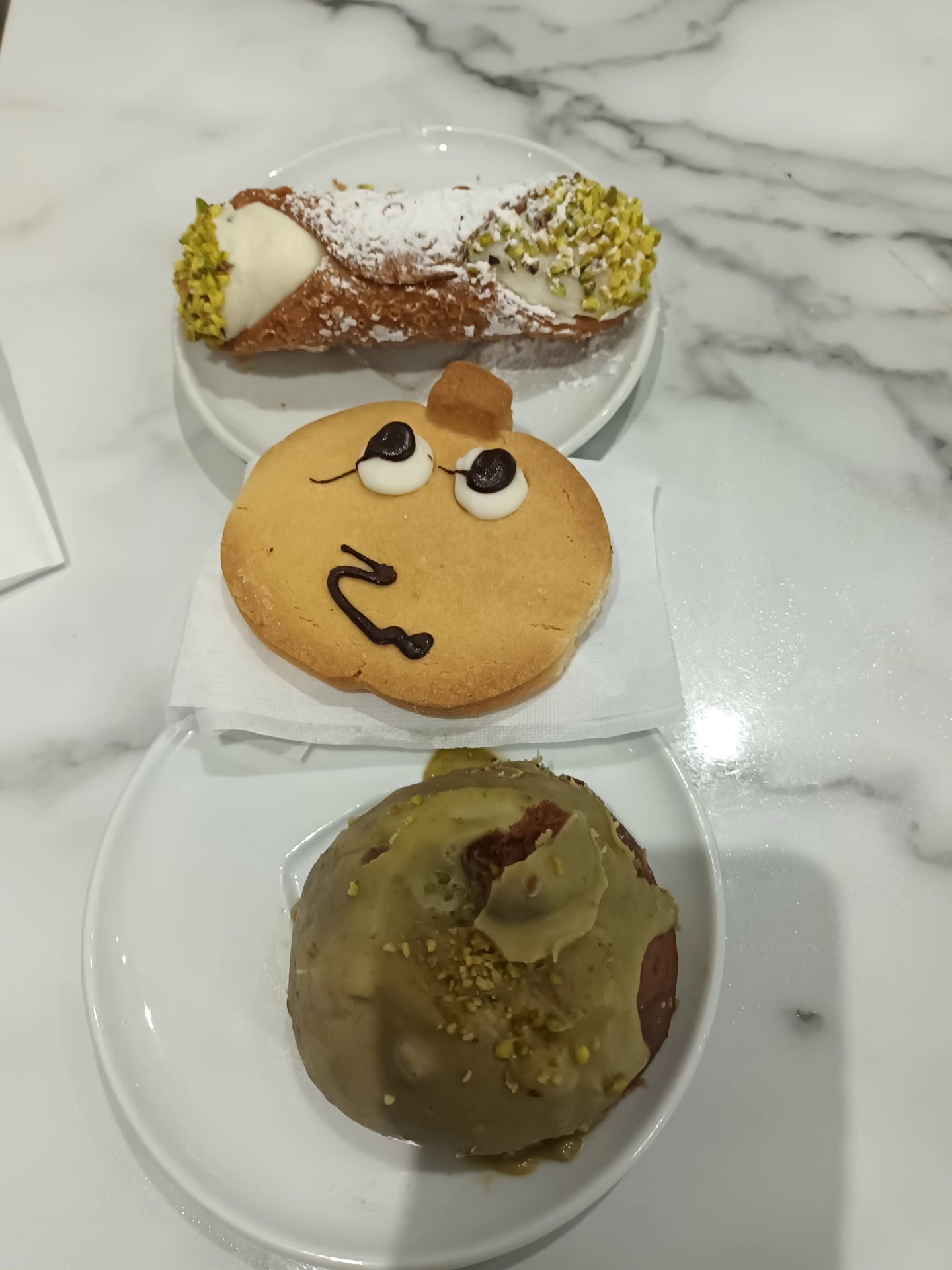 Ho dato 3 stelle per i dipendenti che si impegnano ha lavorare...il cassiere gentilissimo e la ragazza che ci ha pulito il tavolo. L'ambiente è moderno ed era affilato di clienti. Ma hai me da vera Siciliana non posso dare più di 1 stella ai dolci....il cannolo fresco e riempito al momento , però non aveva nulla di Siciliano la ricotta era sciatta non c'era nemmeno l'ombra della ricotta di pecora .... Nel dolce dei morti mi aspettavo un ripieno di pistacchio, invece nulla... Mi dispiace dovervi fare queste osservazioni ma devo essere sincera.... Magari ha voi piace il cannolo con ricotta vaccina e può andare ma non chiamarlo cannolo Siciliano . Il prezzo nel insieme molto onesto , magari invece 2,50€ il cannolo lo mettete ha 3€ e comprate una ricotta piùg saporita. Grazie per l'ospitalità che...