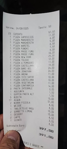 English Mediocre place, made even more mediocre by a pizza that in my opinion is very similar to industrial pizzas, with tomato sauce that tastes like nothing (without salt) and barely adequate dough, clearly expensive for what they serve you, terrible service due to the charge for 6 more bottles of water than what we had ordered... and they are not cheap, but 3 euros each, small dessert at 6.50 euros each and sorbet at 5euros? Cover charge 2.50 euros per person? And when we asked (because there were several of us) why the prices were different from the menu we saw, we were told that it was a menu with prices that need to be updated (??) and all of this in the squalid area of Bussolengo? Are we kidding? First and last visit both as a group and individually, with the crisis that will come, places like this don't last long. In my opinion, to avoid, then everyone decides...