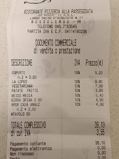 Read moreIeri sera 3 dicembre abbiamo fatto una serata tra amiche al ristorante La Passeggiata, nell’attesa di ricevere le pizze la cameriera ci aveva chiesto se volevamo un aperitivo, le mie amiche chiedono un semplice prosecco che viene portato al tavolo e servito… fino a qui tutto bene! Nella veranda dove abbiamo mangiato la temperatura era piuttosto fredda e diverse volte si era chiesto se potevano aumentarla, cosa che ovviamente non è stata fatta…sono stati piuttosto lenti nel servici e avevamo preso delle pizze normali senza particolari esigenze… fino qui tutto bene.. poi arriva lo scontrino con un totale di 245,90€ che diviso x 9 veniva 27€, già una follia per una pizza e bibita oltre al coperto che era 2,50€ a persona e leggiamo che la bottiglia di prosecco che avevamo chiesto costava 72€😱🤬al che abbiamo contestato in quanto nessuna aveva chiesto una bottiglia così costosa, la cameriera è arrivata direttamente con quella al tavolo, avrebbe dovuto darci la possibilità di scegliere o perlomeno se si sapeva subito che costava così tanto non lo avremmo preso di sicuro, invece trovare la sorpresa sul conto finale non è stato piacevole, quando discutendo con la cameriera abbiamo chiesto di parlare con il titolare inizialmente aveva detto che lo mandava, poi ovviamente non è venuto e ha detto che questa è la politica aziendale di offrire un vino medio alto di qualità… ora se la politica aziendale è di fregare le persone complimenti!! Di sicuro nove persone e quelle che conoscono non verranno più e non ne parleranno bene. Riepilogo: Lunga attesa, ambiente freddo e poco riscaldato, coperto costoso e attenzione ⚠️ super bottiglia di...