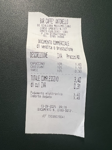 Read more5 stelle meritatissime, la scoperta di questo locale è stata una vera sorpresa, visto da fuori non sembra, ma è carinissimo, accogliente e pulito! Gentilezza sia del proprietario ( col quale abbiamo scambiato due chiacchiere) che del ragazzo al banco. Prodotti eccellenti. Io non amo i cornetti, ma giuro che questi erano magnifici e se non fosse che avevo cominciato con una conchiglia al cioccolato (croccante e divina come piace a me) avrei preso un altro cornetto. €12.10 2 spremute 2 caffè 2 cornetti 1 conchiglia al cioccolato Complimentissimi ! Ci torneremo...