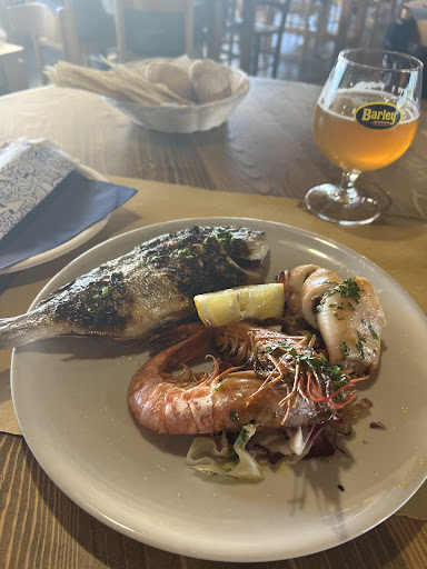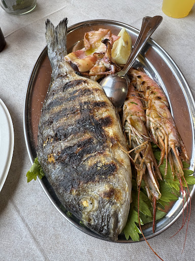 Read moreThe restaurant makes a good impression at first glance. But not so good at second and third and fourth etc. First the good: The food looks good and tastes good too. The waiters are friendly and know what they are doing. Now for the not so good things: The menu is very small and at the prices (€25 for a fish plate without a side dish (costs another €6) you shouldn't have to eat from a paper plate. The dish does come on a porcelain plate, but this is only the serving plate. The bread served is so dry that you can't eat it without a drink (probably intentional so that you drink more). The coffee afterwards is served in a paper cup with a plastic spoon. The toilets should be renovated and a toilet seat would also be great. It's a shame that they take advantage of being the only restaurant on the beach and that as a guest you have no choice but to accept...