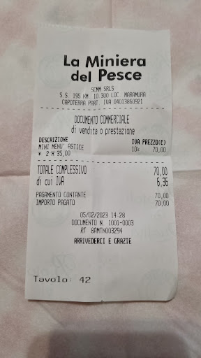 Abbiamo fatto diversi preventivi e tra tanti visto i prezzi identici decidiamo di festeggiare la comunione di nostra figlia qui alla miniera del pesce. Iniziamo con un antipasto di salumi una pirofila da 4 persone messa ogni 8 persone con 4 pezzi di formaggio e prosciutto messo tutto attaccato malissimo bruttissimo da vedere , tra me e me penso “sarà solo la prima portata così ….” Purtroppo non è stato così … arriva il primo malloredus … questa pirofila sempre in mezzo ad 8 persone dove ci troviamo a dividere in piccole quantità un pugnetto ogni persona ed alcune senza mangiare … puntiamo sul secondo grigliata di carne … anche li questa unica pirofila messa in mezzo ad 8 persone li mi sono un po’ scocciata ed ho chiesto alla cameriera , facendogli notare delle portate precedenti e DAVVVERO MOLTO SGARBATA mi risponde malissimo ed è andata a lamentarsi dai suoi colleghi pure ad alta voce perché la si sentiva sino al tavolo , cameriera alta 1,60 capelli lunghetti biondina mai vista una così sgarbata …ciò che chiedevo io ,visto che in tanti non hanno mangiato soprattutto la sottoscritta incinta al 9 mese …,era semplicemente se poteva portare qualcosa in più visto che Avevamo FAME . insomma , serata da dimenticare. La cosa più brutta che oltre ad aver pagato non pochi soldi , sentir lamentare i miei ospiti … che avevano fame che la roba era scarsa che 2 camerieri erano anche maleducati … non è stato per niente bello.