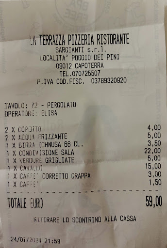 Read moreWhat a wonderful lunch we had here late last month! We were flying out that evening after two weeks in Sardinia. We had read about La Terrazza on the Eater website. When we showed up, they were only serving apertifs. But Giuliano was kind enough to speak with the chef in the kitchen and make an exception. A delicious antipasto platter. Scumptious cheeses. The culurgiones were exceptional. The marinated olives, so good we bought a jar to bring home to family. All of this, served with warmth and courtesy by Giuliano. He even shrink wrapped the jar of olives for transport in a suitcase. We had driven a couple hours to get to La Terrazza and we had hours of travel still ahead of us, but this lunch made our day! What a treat! Highly recommended! And thank you...