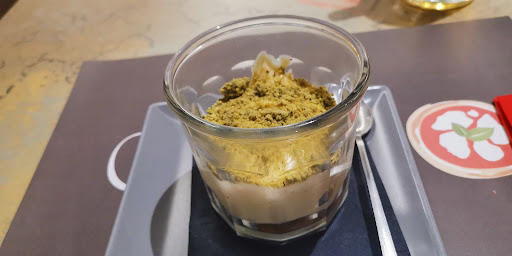 Entro ed aspetto un attimo e chiedo per un tavolo. Aspetto che arrivi la cameriera e poco dopo mi propone un tavolo o un altro a mia scelta per accomodarmi. Protano il libretto del menù , anche se noto sopra il tavolo una tovaglietta con stampato a lato un "qrcode" alquanto poco attraente/distaccato come modo per far vedere il menù. Il "qrcode" non lo considero proprio. Faccio la mia ordinazione e pochi minuti dopo arriva la birra e dopo un tempo ragionevole arriva la pizza. La qualità della pizza e stata molto buona. Terminata la pizza, ordino un tiramisù con pistacchio. Una volta concluso il dolce, vado alla cassa per pagare il conto : Una pizza con impasto multicereali, una birra media, un tiramisù per un totale di 27 €.