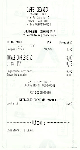 Ore 13.50 del 28 dicembre, Caffè De Candia al Bastione Saint Remy a Cagliari. 8 euro per due Campari Soda al tavolino, desolatamente senza un’oliva né una patatina. Dopo 15 minuti abbandoniamo il Caffè, per sempre.