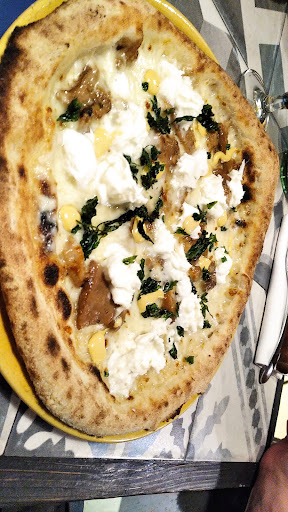 Read moreConoscevo la pizzeria solo di nome, ma non ci ero mai stato, alla fine convinto dalle ottime impressioni di cui mi hanno parlato l'ho provata! Inizio dai punti positivi, a primo impatto il locale l'ho trovato molto carino, forse un po piccolo con i tavoli troppo attaccati, ma lo stile leggermente industrial, che a me piace tanto, mi ha colpito subito. Il personale tutti veramente gentili e a modo, fin dal momento dell'entrata. Arriviamo però a tutto ciò che mi ha fatto storcere il naso, sorvolando sul fatto che la sala al primo piano, probabilmente dovuto alla presenza della cucina sottostante era un forno, sono rimasto innervosito dal troppo caldo tutta la serata (oltre che per nulla arieggiata si respirava un'aria proprio pesante), da starci praticamente a maniche corte, peccato che siamo a marzo e non a luglio (quindi uno gira con il maglioncino quantomeno). Arriva il menu, pochissime pizze senza nomi bensì numeri, alla fine decido di personalizzarmela un pochino, mai l'avessi fatto, tra impasto integrale e un'altra aggiunta mi è venuta a costare solo la pizza 20 euro, buona ma c'è di meglio. I carciofi saltati duri come non so cosa, ho dovuto mangiare la pizza scartandoli e mangiandoli dopo perchè erano piuttosto fastidiosi da masticare insieme alla pizza, concludo con la provola che non era nemmeno sciolta ed erano delle "rondelle" affettate finissime. Ordiniamo il dolce, 7 euro di cheesecake (l'una) che ci arriva all'interno di un barattolino, per questo prezzo mi aspetto che QUANTOMENO sia una fetta decente di cheesecake (stile fetta di torta) non un barattolino stile omogenizzato con all'interno un dolce che topping a parte non aveva molto da dire. Il biscotto sbriciolato non aveva gusto di nulla, probabilmente totale assenza del burro che compattasse il tutto, mentre il formaggio altro non era che una mistura forse di panna?! Alla nostra lamentela sul dolce che non diceva tanto ci è stato risposto con un sufficiente "questione di gusti". Sicuramente il tutto migliorabile.