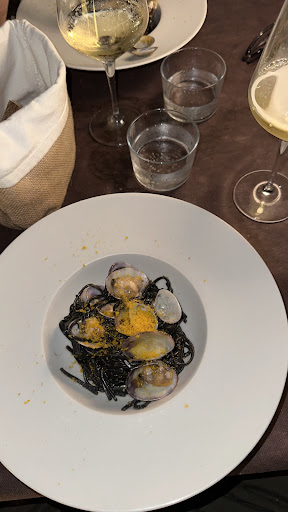 Il piatto principale – spaghetti al nero di seppia con bottarga, vongole e limone – si è rivelato un completo passo falso. Il menù, dichiaratamente basato su ingredienti freschi di mercato, proponeva soltanto tre piatti caldi e un numero ridotto di antipasti, con preparazioni semplici e prive di particolare originalità. Nel caso specifico, la pasta non era realizzata con nero di seppia fresco, ma con un impasto industriale aromatizzato al nero di seppia, facilmente reperibile in qualsiasi supermercato. Le vongole contenevano sabbia evidente, segno di un’errata o assente pulizia. La bottarga era grattugiata in maniera grossolana, con frammenti troppo grandi lasciati nel piatto, e il limone sovrastava completamente il sapore complessivo, annullando la delicatezza degli altri ingredienti.
