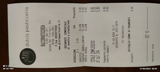 Le paste e le torte, in linea con l'alta reputazione della catena Dulcis, erano impeccabili e deliziose, tuttavia i prezzi, più alti rispetto ad altre sedi Dulcis, potrebbero non giustificare la frequenza di questo specifico locale.