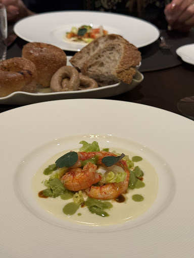 We opted for the three-course menu, mixing antipasti, primi, secondi, and desserts. • Bread service was excellent: three varieties (a crisp biscuit-like bread, a pepper bread with olive oil, and a seeded bread with whipped butter). • Antipasti were standout dishes, especially the grilled Villasimius prawns with “acquasale”, perfectly cooked and beautifully sauced. • Among the primi, the round zucchini ravioli with scorpionfish, plum broth, and goat cheese was a highlight — light yet intense, full of flavour. The linguine with roasted peppers, lamb tartare, and miso was another strong dish, the lamb so finely prepared it melted into the pasta. A tribute to Provence (tubetti with bouillabaisse and tapenade) came across like a refined lobster bisque, complex and satisfying. • Secondi (mains) included a hay-smoked duck with ’nduja, corn, and nasturtium — pink, tender, and balanced by the sweetness of corn. The pork belly with apricot sauce was beautifully flavoured, though the fat could have been rendered more thoroughly. • Desserts were mixed: the peach from San Sperate with curry and salted almond was delicate and well layered, while the seasonal fruit and vegetable salad with red basil ice cream was refreshing and playful. The coconut, coffee, and licorice combination, however, felt unbalanced and less enjoyable.