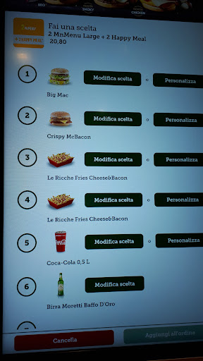Read moreOggi sono venuta con mio marito a farci un pranzo veloce e abbiamo deciso di prendere 1mc menù famiglia con la fame che avevamo..abbiamo fatto l'ordine in uno di quei totem ma non riuscivamo a comcludere l'ordine , vedendo un dipendente GIANMARCO gli chiediamo aiuto, prova lui, ma ci dice: il totem deve essere impallato, e ci consiglia di avvicinarci alla cassa che in quel momento era libera, ma mio marito cambia totem "visto che quel altro era impallato " ma non riesce a comcludere l'ordine nenmeno nell'altro a quel punto scatto una foto con cel al totem e mi dirigo alla cassa per eseguire l'ordine. Alla casa trovo GIANMARCO e gli mostro la foto del cellulare "bella e chiara" per eseguire l'ordine e lui mi risponde molto scocciato non vedo e allora gli detto l'ordine, alla fine l'ordine mi chiede: happy meal??? Io non conoscendo il menu di McDonald ripeto: happy meal??? E lui molto scocciato mi dice : si happy meal cosa vuole? Io non sapendo che dovevo scelgiere happy meal,lui mi elenca molto scocciato le offerte happy meal. Quindi posso dire: Pessima esperienza, impara a lavorare bene e con educazione e studia il tuo lavoro perché già dal totem l'ordine non si completava perché mancava la scelta degli happy meal. Ps : allego la foto che GIANMARCO non vedeva ( o...