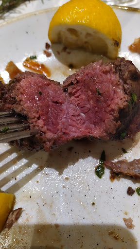 Read moreSiamo arrivati in 4 Poco dopo le 13. Abbiamo ordinato una tagliata con contorno Di verdure grigliate, una cotoletta alla Milanese e due menu' Di pesce da 36 euro. Il ristorante era praticamente vuoto, eravamo GLI unici clienti. La tagliata arriva dopo pochi minuti ricoperta da una montagna Di rucola e grana, senza neanche avvisare il cliente Di come venisse servita o chiedere Di eventuali allergie. Il commensale che ha scelto la tagliata rimarra' poi tutto il pranzo a guardare GLI altri due commensali mangiare il menu' Di pesce. Stesso per la cotoletta alla Milanese che arriva qualche minuto dopo la tagliata. Dopo dieci minuti arrivano GLI antipasti Di mare, cozze secche, frutti Di mare insapore e sicuramente prodotti in fabbrica, gamberetti duri e insapore, seppie e calamari Di plastica...una vergogna. Il servizio e' stato piu' che scadente che neanche in trattoria e nei all you can eat, nulla la comunicazione col cliente ,portavano I piatti alla rinfusa e neanche facevano una descrizione Degli stessi o comunicavano con noi per almeno sapere se tutto stesse andando bene. Niente cambio posate. Quando arriva il primo portano due piatti a testa impilati Uno sopra l' altro, le trofie erano indietro Di cottura e ripresentavano GLI stessi moscardini dello stesso colore e Della stessa consistenza che abbiamo trovato Sia negli antipasti che poi nella spigola. A testimonianza del fatto che il pesce non era assolutamente fresco. La spigola non era male, ANSI L'unica portata che sapeva Di pesce, contornata Dal solito moscardino solitario( da sottolineare senza testa) e da Delle seppie Di caucciu'. Il trionfo a seguire Di un astice congelato, cotto in acqua bollente, fatto raffreddare e Messo in frigo a riposare, servito rigorosamente freddo,insapore e con una salsa che faceva miseria. Mentre arrivano le vedure grigliate Della tagliata dopo circa 20 da quando e'stata consumata. chiedo Al cameriere se il pesce Sia fresco e qualche domanda Sulla provenienza dello stesso e non riesce a rispondere. Arrivano I dolci, due sorbetti prodotti da qualche fabbrica alimentare granitici,e un semifreddo Al pistacchio Che era Duro come stesse scongelando. 130euro, vino Della casa accettabile e pane discreto. Con le Loro potenzialita' Hanno fatto Di tutto per allontanare dei clienti. Molto deludente. Per quanto co riguarda abbiamo avuto l'impressione che la carne venga trattata molto Meglio del pesce, anche perche' la tagliata era...