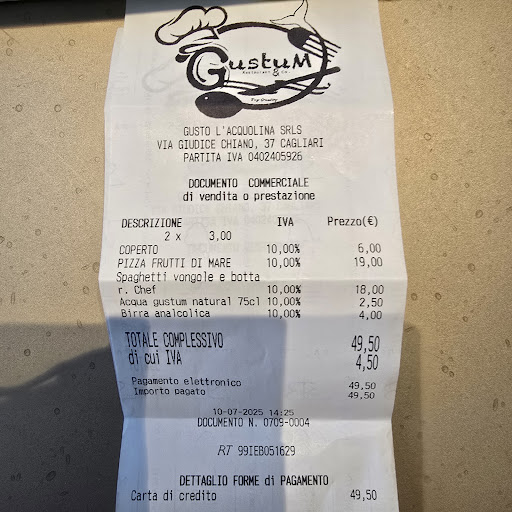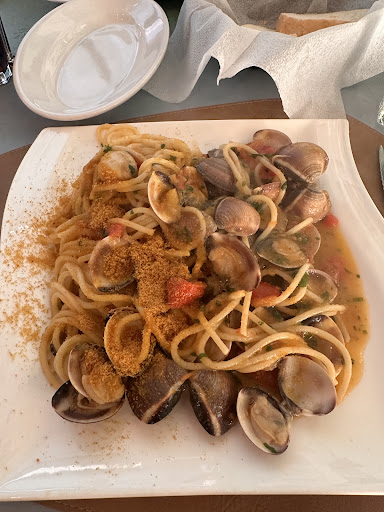 Due to the good ratings we have visited this Restaurant at Lunch-time July, 10th in 2025. Inside you will feel well at once. White table you will see on each table. Fast we have received the Menu from the friendly Server. I have ordered PIZZA FRUTTI DI MARE (19 €) and my Partner ordered Spaghetti Vongole e Bottarga (18 €). The PIZZA is offered in two sizes: Normal and big. I have ordered the normal size which was too big for me when I saw it while it was served. It was good looking. In the middle one fresh (!) Prawn was decorated. The other Seafood was mainly consisting of big Mussels. Some of the other Seafood was a little bit chewy. But more important was that I was almost unable to cut the dough with a knife and of course it has had the same effect when trying to eat it. So I only have eaten two pieces of the Pizza. The middle of the Pizza was prepared with very thin dough. Of course our attentive Server has offered to exchange the Pizza and even to prepare it more crispy. But I have rejected it. Instead of that I have got a Desert from the House. My Partner was satisfied with her Spaghetti. With water and non alcoholic Beer finally I have paid 49,50 € including 6 € COPERTO for two.