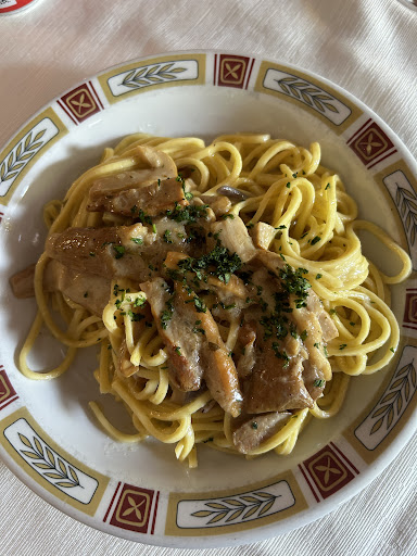 Abbiamo pranzato in 3 adulti più una bambina di 3 anni, pagando 60€ e prendendo 2 primi, 1 secondo, 1 contorno, 2 dolci, vino sfuso, acqua e 3 caffè. Le porzioni non sono particolarmente abbondanti, ma ci siamo alzati comunque sazi grazie al dolce. Il risotto ai funghi era forse anche un po’ scarso di funghi, ma buono. Pasta al ragù di cervo ottima. Brasato di asino buono. Torta di pasticceria senza infamia e senza lode. Coppa di frutti di bosco con gelato e panna molto buona e abbondante. Caffè sopra la media. Il servizio è stato preciso, veloce ma decisamente “freddo”.