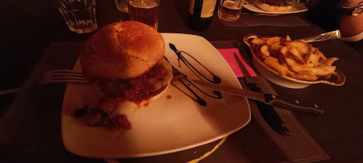Sono stato in questo posto casualmente guardando le recensioni di google. Le foto pubblicate erano molto invitanti. Perciò dopo aver prenotato siamo andati e ho trovato un atmosfera davvero accogliente. Molto bello il locale e le luci. Molto buono anche il sevizio, ci hanno fatto accomodare subito e in poco tempo abbiamo ordinato e sono arrivate subito le portate. Devo dire che il mio hamburger che metterò anche in foto era qualcosa di veramente buono. Carne perfetta, ragù, formaggio, melanzana fritta tipo parmigiana ecc...insomma una vera goduria con un contorno di morbidissime patate al forno. Anche la tagliata del mio amico era veramente buona e ben servita. Ottimo l'idea di servire le portate su pietra. La CHEESECAKE era buona ma non buonissima, un pò troppo pannosa per i miei gusti, si potrebbe dargli più corposità aggiungendo del formaggio fresco spalmabile o dello yogurt greco. Il conto è stato nel nostro caso molto basso ma avevamo una scontistica. In ogni caso avremo speso una cifra giusta. Ci tornerò con altri amici essendo un posto abbastanza grande.