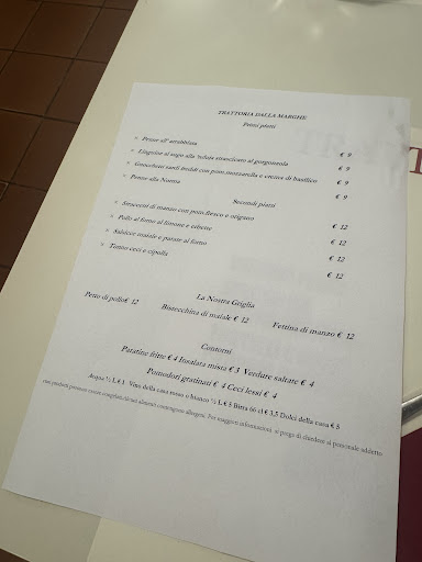 Read moreMi trovo a Calenzano per lavoro. Ieri sera cercando su Google un posto per mangiare ho notato Trattoria Dalla Marghe ma non sono andata perché faceva troppo freddo per uscire. Così stasera sono andata e meno male! Ho mangiato la Peposa di manzo che era da leccarsi i baffi 😋😋😋 e poi leggendo sul tavolo che i dolci si fanno in casa ho provato il tiramisù e credetemi, nonostante l'aspetto era davvero ottimo! Do solo 4 stelle perché ho trovato posto sulla veranda che non è un luogo troppo accogliente. Tornerò sicuramente se mi ricapita di tornare a Calenzano perché è proprio il posto buono dove mangiare una cosa dopo una lunga...