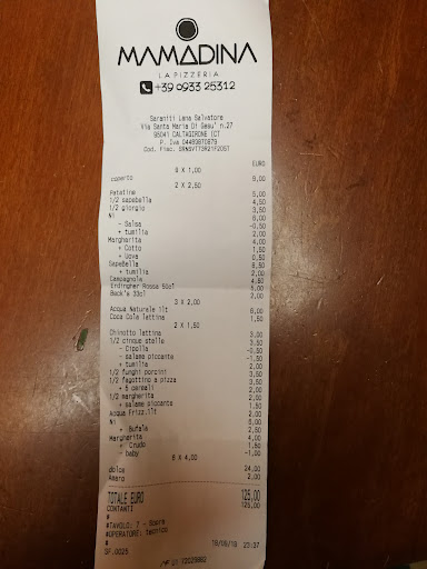 Read moreLa pizzeria Mamadina lleva poco tiempo abierta pero ya se ha hecho un hueco en el corazón de los habitantes de Caltagirone. Su mayor atractivo es que se haya emplazada en una bonita villa que ha sido restaurada con gusto en estilo moderno aunque la mayoría de los comensales prefieren su precioso patio interior donde se puede estar al fresco en las calurosas noches sicilianas. La carta es muy extensa en cuanto a pizzas, donde destaca su "Special One" pero las opciones son casi infinitas. En ensaladas, pastas y carnes las opciones son más restringidas pero también aceptables. A la entrada del local se puede ver su horno de leña tradicional que por supuesto no para de trabajar. Podría alcanzar una puntuación mayor si no fuera por algunos detalles que áun deben mejorar. El personal es joven y no alcanza la simpatía (con algunas excepciones) con un tono algo distante y snob. Los fines de semana además el local está demasiado sobrecargado de gente, ya que admiten grupos celebrando cumpleaños, comuniones etc. con lo molesto que esto resulta. Deberían habilitar algún salón privado dentro de la villa y no mezclar con el resto de comensales que buscan algo de paz. El sistema para sentar a los clientes además es totalmente aleatorio y parece que mientras uno espera estoicamente en fila junto calor agobiante del horno durante media hora o más (los supuestos 10 mins anunciados) ves cómo van pasando parientes, amiguetes y gente del pueblo sin ningún rubor delante tuyo. Con todo, una buena opción en la zona nueva de...