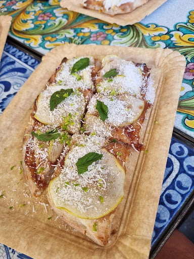 Today we ate at Pinsè in Caltagirone, a small pinseria (Roman fluffy pizza) with vegan options. The waiter kindly explained the entire menu and then wrote directly on the menu for us vegans what we could eat and what we could change to make the dish vegan. Basically, where he put the X, it's not vegan; everything else is vegan or can be veganized (see my photos) We had panelle, zucchini flowers (not stuffed, just made with batter), pinsa marinara without anchovies, and the sweet pinsa with strawberry jam, apple, and coconut. Kudos to the waiter with green hair who was so polite and very professional with his explanations, we were thoroughly impressed with his service and also the service of the young lady working there too. We had a wonderful day out with family in Caltagirone and our lunch here was a large...