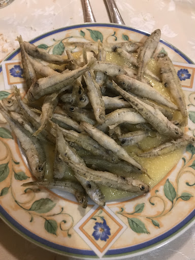Come antipasto delle anguelle fritte su letto di polenta, accompagnate da un piatto di moeche (diciamolo subito: tanta roba queste).