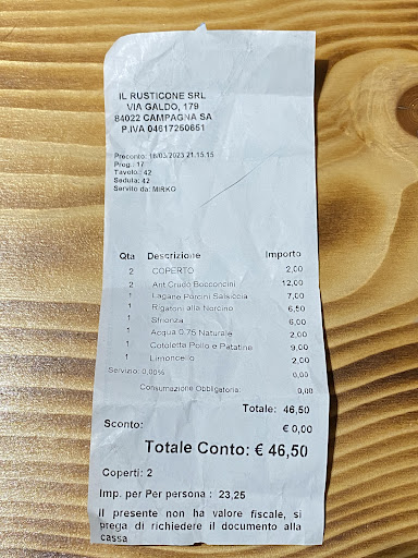 Read more"Rusticone" è un ristorante che si distingue per la sua proposta culinaria autentica e ricca di sapori. Situato in un ambiente accogliente, riesce a trasmettere un'atmosfera calda e familiare, ideale per una cena romantica, una riunione con amici o un pranzo in famiglia. Il menù offre una selezione di piatti che riflettono la tradizione gastronomica locale, con ingredienti freschi e di alta qualità. I piatti sono preparati con cura e attenzione, e le porzioni sono generose. Tra le specialità, si possono trovare primi piatti fatti in casa, carni cotte alla perfezione e dessert deliziosi che chiudono in bellezza ogni pasto. Il servizio è un altro punto forte del ristorante: il personale è cordiale, attento e sempre pronto a consigliare le migliori opzioni del menù, oltre ad offrire un'ottima selezione di vini da abbinare ai piatti. In sintesi, Rusticone è un luogo dove si può gustare un’autentica esperienza culinaria, con un'ottima combinazione di sapori, un servizio impeccabile e un'atmosfera invitante. Consigliato a chiunque voglia scoprire o riscoprire i piaceri della...