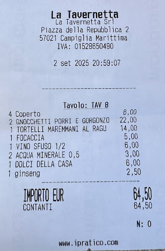 Read moreWir waren gestern mit zwei Kids in der „La Tavernetta“ um nach einen Rundgang durch das schöne Städtchen noch Abend zu essen. Uns wurde ein kleiner Tisch für vier Personen zugewiesen welcher auch schnell eingedeckt wurde. Leider sind die Bedienungen eher hektisch auf „Abfertigung“ aus gewesen (was aber so aus sah als dass der Chef des Hauses? Druck gemacht hat) Zum Essen: Zwei Bambini Menüs und für uns einen Pulpo als Antipasti und Wildschwein (zzgl gegrilltes Gemüse) sowie Bandnudeln mit Wildschweinhackfleisch/-Soße. Das Essen wurde schnell gebracht, leider alles zeitgleich, somit war der Tisch übervoll und mein Wildschwein fast kalt bis ich mit der Antipasti fertig war. Die Pasta war in Ordnung, wenn auch nicht überragend. Ebenso beim Wildschwein welches teilweise etwas trocken war. Gemüse eher kurz im Öl gedünstet als gegrillt. Schade! Der Pulpo (Krake) war dafür ausgezeichnet. Auch die Kids waren zufrieden. Bier für italienische Verhältnisse eher „günstig“ und der Hauswein war fruchtig und leicht. Alles in allem würde ich aufgrund der gewollten Abfertigungs-Hektik, fehlenden Freundlichkeit und nicht besonderem Essen nicht wieder kommen. Preis-/Leistungsverhältnis leider auch...