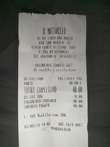 Read moreIn 4 prendiamo uno spritz, un calice di vino e un campari soda, chiediamo di portare due stuzzichini costituiti da una fetta pizza margherita da forno (molto secca), una fetta di rustico provola e mortadella (pasta sfoglia da supermercato) e una fetta piccola di crostata ricotta e cioccolato. Prezzo finale: 40 euro! Premetto che lo scontrino non recava alcuna specifica ma dava direttamente il totale in più il pagamento è stato effettuato con carta ma viene indicato "in contanti"(vedi foto). Gli viene chiesto di emettere le singole portate con relativi prezzi, chiaramente NON ESPOSTI, dopo essersi palesemente incartato alla richiesta di trasparenza aggiungendo maldestramente e frettolosamente i prezzi richiesti, scopriamo che il rustico (da supermercato) è venuto circa 9 euro. Concludo dicendo che mentre andavamo via, un gruppo di 4 persone discutevano con il proprietario del medesimo problema: prezzi altissimi non esposti né chiaramente indicati sullo scontrino, poca chiarezza in generale, alla fine il gruppo chiedeva di conoscere il prezzo della pasta fresca acquistata ad un prezzo certamente disonesto. Fregano i turisti (...