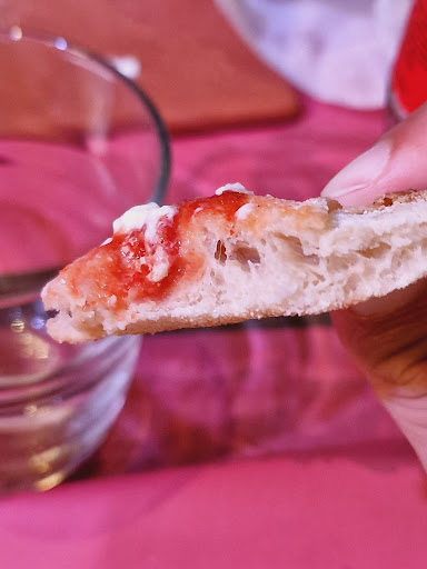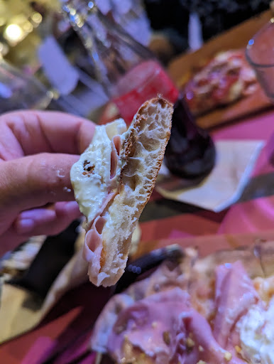 Read moreCi siamo recati presso Botega Pinseria per gustare una delle pinse di loro produzione, anche invogliati dalle recensioni piuttosto positive. Che dire, pessima scelta. Ambiente senza pretese in cui, nonostante si pasteggi su tovagliette di carta e con tovaglioli di carta, viene addebitato il coperto (2€) denominato però "servizio". Pinsa carissima, sui 15€ l'una, nonostante la fattura pessima del prodotto. Abbiamo preso una Andalo e una Accademia, l'ultima in particolare è stata servita con impasto al limite del poco cotto (come da foto). Pinsa che per sua caratteristica dovrebbe presentarsi con un impasto idratato (~80%), alveolato e strutturato era invece sottile e condito miseramente oltre che per nulla fragrante. La Accademia, da menu composta da base rossa, acciughe burrata e basilico; era condita con salsa di pomodoro, probabilmente neppure cotta assieme alla pizza (vista l'acqua di pomodoro assorbita dall'impasto) , acciughe tolte dal barattolo ed aggiunte dopo cottura ed una sola foglia di basilico posizionata sopra la burrata. Che...