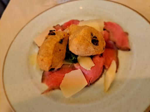 Β Β Β Read moreSe il locale all'esterno con lucette accese, a febbraio, Γ¨ forse un po' trash, all'interno Γ¨ molto ben curato ed accogliente. Sono rimasto deluso dal cibo, eravamo in 4, menu' degustazione carne uguale per tutti. Se l'antipasto poteva andare, considero inaccettabile che mi venga portato il primo di pasta tiepido tendente al freddo! Nel locale c'eravamo solo noi, stesso menu' ma la portata sembrava quella rimasta all'ultimo della fila in mensa. Per il secondo, se la carne, guanciale di maiale cotto a bassa temperatura, era buono, lo stesso non si puo' dire delle verdure grigliate. Fredde! Sembravano cotte a mezzogiorno e lasciate in cucina per la sera! Dolci questi all'altezza, gradevoli i bonbon alla grappa portati con il caffΓ¨. Per i soldi spesi, (45β¬) non consiglio sicuramente l'entrata. Se una stella non la si nega a nessuno, la seconda va' al servizio. Questo si' veramente...