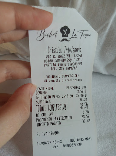 Read moreUna bellissima scoperta in un caldo pranzo di Ferragosto! In una strada un po' fuori dalla zona pedonale si apre il Bistrot La Toque che ci ha proposto una serie di antipasti di pesce, serviti con la filosofia delle tapas: assaggi di piatti, uno piú goloso dell'altro! Abbiamo mangiato sei piatti: bruschetta con tagliatelle di seppie e cipolla di tropea marinata, buonissima e molto equilibrata cozze "cacio e ovo", spaziali polpo all'acqua pazza, servito su un tarallo lungo, molto saporito seppioline su crema di piselli (freschissimo!) gamberone impanato nel panko e servito con stracciatella e pomodorini (cosí invitante che la foto è stata dimenticata...) Per concludere ci hanno chiesto se volessimo un primo o un secondo ma eravamo talmente sazi che abbiamo chiesto solo un ultimo piatto, magari con della verdura: ci hanno servito dei gamberi spadellati saporitissimi su una caponatina eccellente. Il tutto condito da taralli buonissimi ma soprattutto la cordialità di cuoco e consorte, splendidi! Insomma, non aspettatevi un menu ma lasciatevi guidare dal cuoco: non ve ne pentirete ;)