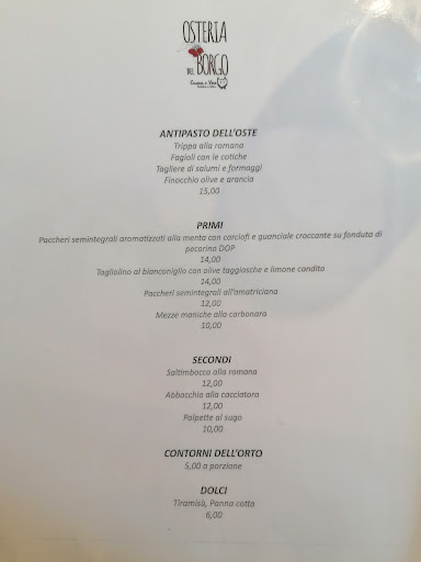 Read moreMarco S. Arrivati in questo paesino della Sabina per la tolettatura del lagotto e grazie al consiglio del Tolettatore siamo stati in questa Osteria del Borgo. Che dire esperienza ottima sotto tutti gli aspetti . Accolti alla grande come dovrebbero fare tutti i ristoratori . Disponibilità,servizio e soprattutto una cucina con materie prime ottime a partire dall'ottimo tagliere di affettati e fritti fatti al momento, primi veramente molto buoni , per finire panettone e pandoro artigianali e torrone . La prossima volta assaggieremo sicuramente anche i secondi visto che eravamo veramente sazi. Consiglio a tutti di fare un salto in questa...