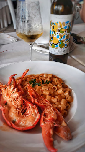 All'interno il locale ha l'identità confusa tra espositori dei vini di tipi e generi diversi, divani delle epoche passate, fiori finti e ogetti varie. Pure rivestimenti interni è un caos di stili. Però ho trovato l'attenzione alla pulizia dei bagni, sala e tavoli - lodevole. Personale è molto attento al cliente, simpatico veloce ed efficace. L'antipasto e stato molto buono. Sia di mare e di terra. Fritti eseguiti molto bene - croccanti al punto giusto, pesce fresco, nulla da dire. Purtroppo com le pietanze principali siamo andati - malissimo Preso l'unica proposta di primo di terra - ravioli con carciofi e guanciale, bilanciato con sapori e grassi male ed esteticamente non ti invogliava ad assaggiare. Ma il problema più grave è stata il trancio ricciola grigliata, che sapeva di lunghissima carriera fatta nel frizzer . Odore del grasso vecchio del pesce e gusto amaro. La parte che comunque ho assaggiato era amara. Infatti più tardi mi sono sentita male. Secondo me oggi rischiare la reputazione del locale per il pesce andato felicimente in pensione ancora nei tempi della prima guerra mondiale - non vale proprio la pena. Peccato. Pensavamo di diventare i...