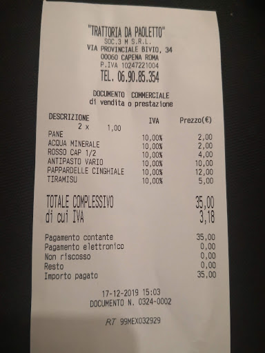 Read morePessima, siamo entrati e dopo averci fatto sedere ci hanno detto che la cucina era chiusa e non era possibile avere i primi, (se me lo diceva prima saremmo andati via) gli chiedo il menù e mi dicono che era a voce, avevano un antipasto all'italiana e la carne, il tutto senza sapere i costi, ordiniamo antitipasto per 2, ed era proprio per 2, 2fette di salame2fette di prosciutto e 2 fetto di capocollo, non vi erano formaggi, ma a voce c'erano, una ciotolina di fagioli, una ciotolina di panzanella (pane bagnato e un mistino di sottaceti) 2 pezzettini di una frittata e 4 bruschette 2 semplici e 2 al pomodoro per la modica cifra (scoperto Dopo) di 22 euro (una rapina, con l'aggravante che le bruschette erano a parte 6 euro) per secondo abbiamo chiesto cosa c'era "non avendo un menù" e la cameriera mi ha elencato delle cose eabbiamo deciso per gli arrosticini una porzione bastava la ragazza mi aveva detto sono 10 arrosticini a porzione "ne sono arrivati 8" altro furto, 1 tiramisù e un caffè per finire, 64 eurini di conto naturalmente non fiscali. Do un Consiglio ai proprietari, fatevi un esame di coscienza, e un consiglio a chi legge fidatevi NON CASCATE I QUESTO Posto, in ultimo la location un locale fermo agli anni 70 molto squallido se almeno il locale era bello avremmo pagato volentieri il posto purtroppo...