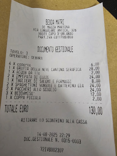 Durante la mia recente visita al Bedda Matri Bistrot, sono stato accolto con grande professionalità e cortesia. Il personale si è dimostrato attento e disponibile, creando un'atmosfera piacevole e rilassata.