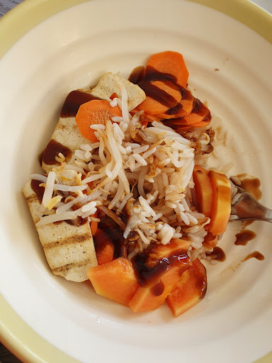 Had the worst vegan Poké Bowl of my life- Pic speaks for itself. In fact this mash of cold, soggy rice, hard carrot, bland Tofu, mushy soy sprouts and Papaya does not deserve the name "Poké". Lowlight was the off-the-counter Teriyaki sauce on top of it. Should have opted for the fries instead. I give 2 stars nevertheless for a) vegan options available / soy cappuccino and b) the fact that we did not have...