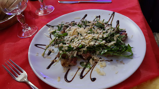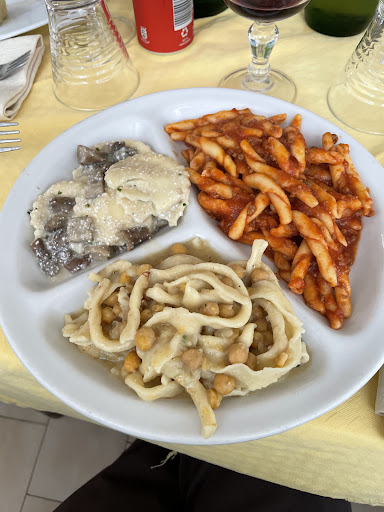 Read moreQualità divertimento ci sta', don peppino molto simpatico è praticamente il punto forte. La carne buonissima (ho preso il Menù, e scelto la bistecca di vitello) molto tenera, ma per il resto, la pasta: voto 2,5. La frutta (di stagione): voto 2, il vino scadente ma tanto. Prendendo il menù c'è a disposizione un tris di primi (fusilli alla bolognese, tagliatelle ai ceci e ravioli ripieni di ricotta con i funghi), funghi inesistenti, pasta scotta tantissimo. Per il servizio ti portano i fusilli nel piatto (eravamo 10 persone), e poi per i successivi primi portano due portate al centro tavola, stessa cosa il dolce (una crostata) e per la frutta...die portate al centro tavola, per la frutta c'erano due mele mini insapore, le pere altrettanto e cachi da buttare (buttati). Punto di forza: la carne, le canzoni con don Peppino, gentilezza da parte del personale. Ma...