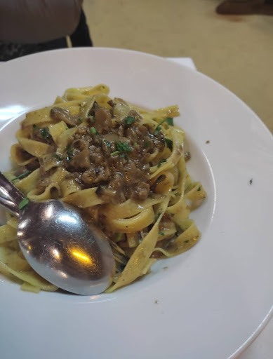 The atmosphere in the restaurant was rather cold and quiet. The starters were fine, but nothing special, no home made pasta and ready to serve meals. As a main we had a pizza with truffels which was good as well as very delicious red wine. The desert (pana cotta with frutti di bosco) looked like a scrambled egg, taste was OK.