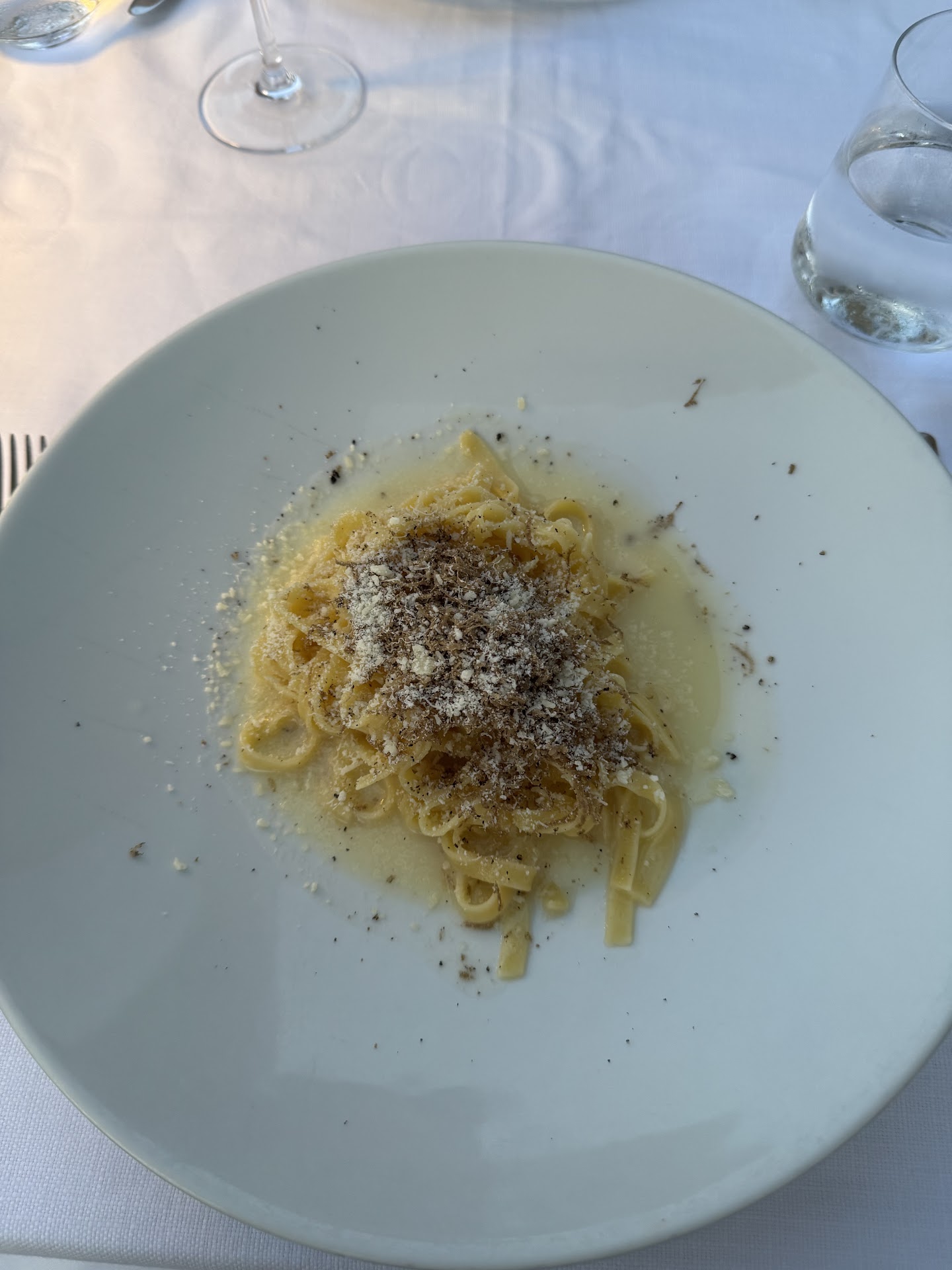 We started with the octopus and zucchini flowers, which were some of the best we’ve ever had—perfectly cooked, flavorful, and beautifully presented. For our main courses, we ordered three different pastas: the linguine all’astice (lobster pasta), scialatielli ai frutti di mare (seafood pasta), and linguine bolognese.