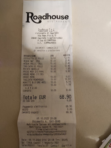 Read morePremetto che non faccio mai recensioni negative. Non è nel mio carattere....ma stavolta.....Sono tornato in questo Roadhouse dopo quasi un anno dall'ultima volta. Mi sono sempre trovato bene ed ho mangiato sempre in modo soddisfacente ma purtroppo mi sono stupito dal peggioramento del servizio e anche del cibo. Innanzitutto ho prenotato per le 19:15 e mi sono seduto alle 19:45 perché all'ingresso non viene smistata la clientela con e senza prenotazione, e si resta così un attesa parecchio tempo. Le bevande sono arrivate 20 minuti dopo e il cibo dopo un'ora. Ho ordinato una grigliata mix (già presa altre volte in questo ristorante), è arrivata una roba scandalosa. Il petto di pollo non c'era, al suo posto un trito di pollo asciuttissimo che pareva avanzo di altri piatti. La tagliata amarissima e cotta malissimo, le salsiccette (2) discrete e del resto non c'era nulla, tipo il maiale che compare nel menù, non c'era. Non ho mangiato quasi nulla perché il piatto non era presentabile ed inoltre aveva pure un cattivo odore. La responsabile mi ha chiesto se lo rivolevo ma ho detto di no. Di quel poco che ho mangiato mi è rimasto un fastidioso reflusso per tutta la notte. I ragazzi e le ragazze del servizio al tavolo sono disorientate, pare non abbiano mai fatto nulla del genere. Ci continuavano a dire che serviva pazienza perché "c'è un gran casino stasera" in realtà il ristorante era mezzo vuoto. Ho messo 2 stelle anche se ne meritava 0, perché le responsabile, non ci ha fatto pagare nulla, probabilmente cosciente delle difficoltà del servizio e della cucina, ha preferito optare di non farci pagare nulla. Sinceramente mi dispiace perché preferisco sempre pagare anche se mangio male, ma ha insistito e quindi non ho pagato nulla. Spero possa questo ristorante tornare alla qualità e all'efficienza di...