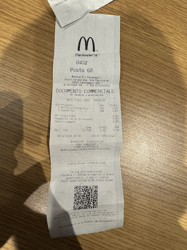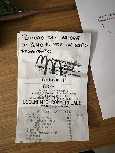 Se potessi dare 0 stelle lo farei, solo per la scarsissima qualità del servizio.Dal monitor pago (pagamento effettuato), ma non funziona e non esce la scontrino.Maleducatamente vengo costretta ad effettuare un nuovo pagamento se intendo consumare,nonostante mostri da app bancaria che il pagamento precedente è stato effettuato. Avendo portato due bimbi in attesa di happy meal e giochi non posso cambiare posto, quindi mi limito al riacquisto di due happy meal per i bambini, escludendo il resto del mio ordine che comunque mi è passata la voglia di consumare.Dopo circa 20 minuti mi viene detto che l'ordine precedente è arrivato, quindi effettivamente era stato pagato, me ne viene data parte e sul resto mi viene fatto un buono.Cioé scorrettezza allo stato puro.Faccio notare che cosi mi costringono a tornare da loro per utilizzare un buono che non ho chiesto, mi viene risposto che posso acquistare 9 euro di prodotti per la colazione del giorno seguente se non intendo tornare..Mai successo nulla del genere..assurdi.Onestamente il buono lo ho regalato, io in quel posto non ci metterò mai più piede, e lo sconsiglierei a chiunque. Pessimo servizio, pessima comunicazione e scorrettezza totale (se non mi fossi rovinata ulteriormente la serata avrei chiamato...