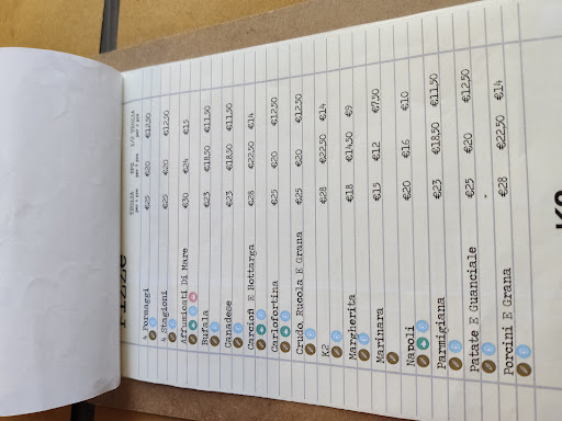 Una volta chiesto un tavolo per due, sembravano titubanti e dopo qualche minuto ci hanno fatto accomodare fuori. Successivamente, dopo 5 minuti circa, ci hanno portato il menu e i sottopiatti insieme ai bicchieri. Il menù è ben presentato ma mancano gli ingredienti in ogni singola pizza. Nessun ingrediente. Soltanto le icone degli allergeni sotto il nome di tutte le pizze. Essendo in due, la scelta di una sola pizza è limitata dalla concordanza di entrambi.