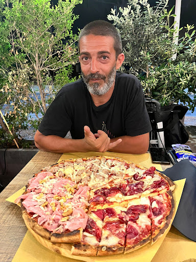 Initially, we wanted to have dinner in Sant’Antioco, but we were not welcomed at all. We were told that all the available tables (there were several free tables at different restaurants) were reserved. So, we decided to try the pizzeria near our hotel, which we had walked past the night before. Despite the Saturday night rush around 10 p.m., we were received very warmly.