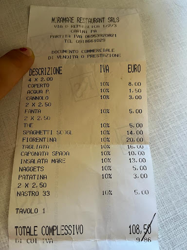 Peccato che non si possa mettere meno di una stelle, comunque se volete passare una serata ad aspettare ed essere presi in giro da una cameriera che pensa che la gente è stupida fate pure, ma siete avvisati. Antipasti insalata mare che non era male anche se avevo chiesto niente sedano e giustamente è arrivata col sedano, caponata di pesce spada andata a male, chiamiamo per dirglielo magari non se ne erano accorti e mi è stato detto che le melanzane non sono di stagione e che per salvare il pesce spada hanno messo l aceto, ripeto a fine estate le melanzane non sono di stagione, cose da lanciargli il piatto dietro anche solo perché lei forse non si aspettava di trovare un tavolo di persone che lo hanno avuto un ristorante e sanno cosa è andato a male e cosa no. Tralasciando il fatto che ci ha fatto pagare una caponata andata a male e rimandata indietro, ho chiesto una fiorentina vi allego la foto, e beh questa ti sembra una fiorentina ? È una fettina di carne fina fina è passata nella padella e mi è arrivata anche fredda quindi dura in un modo incredibile. Quanto L ho pagata? 20 euro una fettina di carne fina, rinsecchita e che non era una fiorentina e sicuramente non era 400g. Il mio consiglio è di non andarci, a questo prezzo potete mangiare in un ristorante migliore. C’è sinceramente non credo si possa...