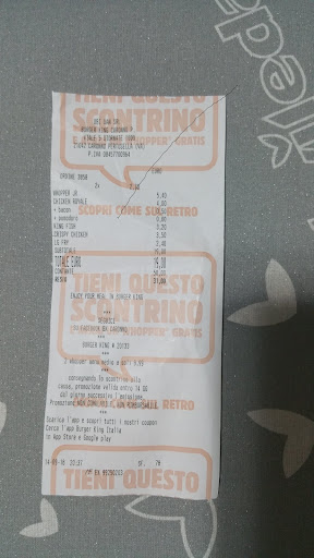 Read moreÈ difficile... Quando si pensa ad un fast food, il primo pensiero va al mc Donald's... Ma per dire se è meglio o peggio, tralasciando gli ovvi ed unici gusti personali, bisogna fare alcuni punti distinti cibo: per me nettamente superiore, la carne sa realmente di carne alla griglia, al contrario del MC dove generalmente le salse coprono bene i gusti basilari di un hamburger. servizio: qui vince il MC... Ma non per mancanze del personale del burger king, anzi, ma perché bisogna ancora fare le code alle casse, e tante volte vedendola, vado dritto al mc che dista due km, dove il sistema di ordinazione è velocissimo, efficiente, esente da coda. Geniale. prezzi: più o meno siamo allineati. Forse una nota in più di merito va al burger king dove si può bere a volontà col self service. locali: i burger king in genere li ho trovati sempre più ordinati e puliti, ma non mi sento di dire che i MC siano sporchi, perché spesso dipende solo dalla civiltà di chi li frequenta.