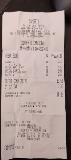 Read moreAbbiamo scelto di cenare da Sapurito per le recensioni positive e non riesco a capire come possa avere un punteggio che supera il 4 dal momento che è stato veramente un disastro. Abbiamo ordinato una pizza, due panini di mare e una tagliata di tonno. Fatta eccezione per la pizza che definirei "mangiabile", tutto il resto una delusione totale. I panini di mare , al prezzo di 14 euro, erano senza sapore, il pane secco e in un panino abbiamo trovato un capello. La tagliata di tonno in realtà era una tataki di scarsa qualità, sembrava di quelle in busta,il tonno senza sapore, servito con una salsa teriyaki salatissima, inoltre da menù il piatto riportava verdure croccanti ed è arrivato il sedano e delle carote con una parte della buccia sporca. Non riesco veramente a comprendere come un locale possa servire dei piatti così!